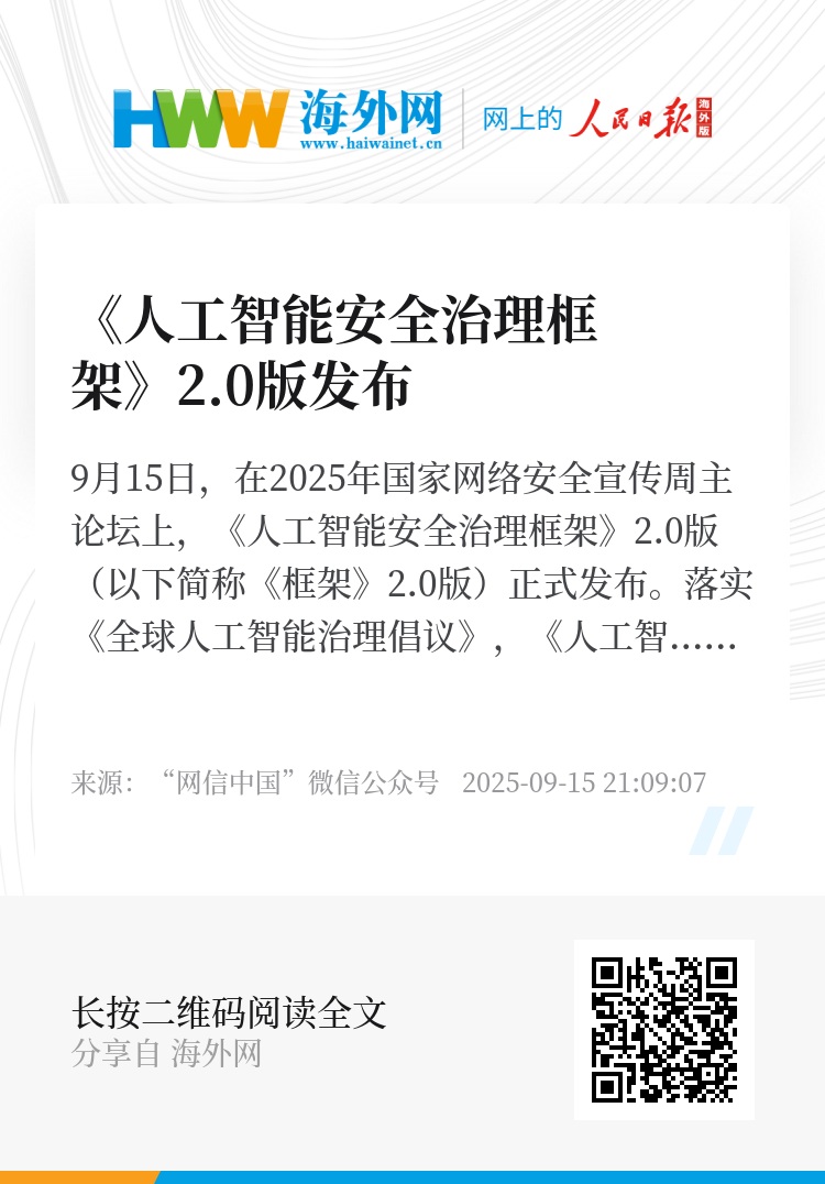 9月15日,在2025年国家网络安全宣传周主论坛上,《人工智能安全治理框架》2.0版(以下简称《框架》2.0版)正式发布。