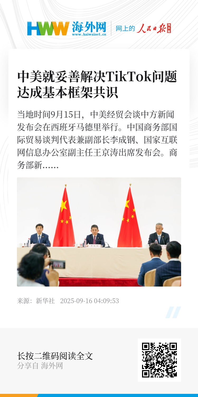 新华社马德里9月15日电(记者谢希瑶 丁英华)中国商务部国际贸易谈判代表兼副部长李成钢15日傍晚在此间表示,中美双方就以合作方式妥善解决TikTok问题、减少投资障碍、促进有关经贸合作等达成了基本框架共识。