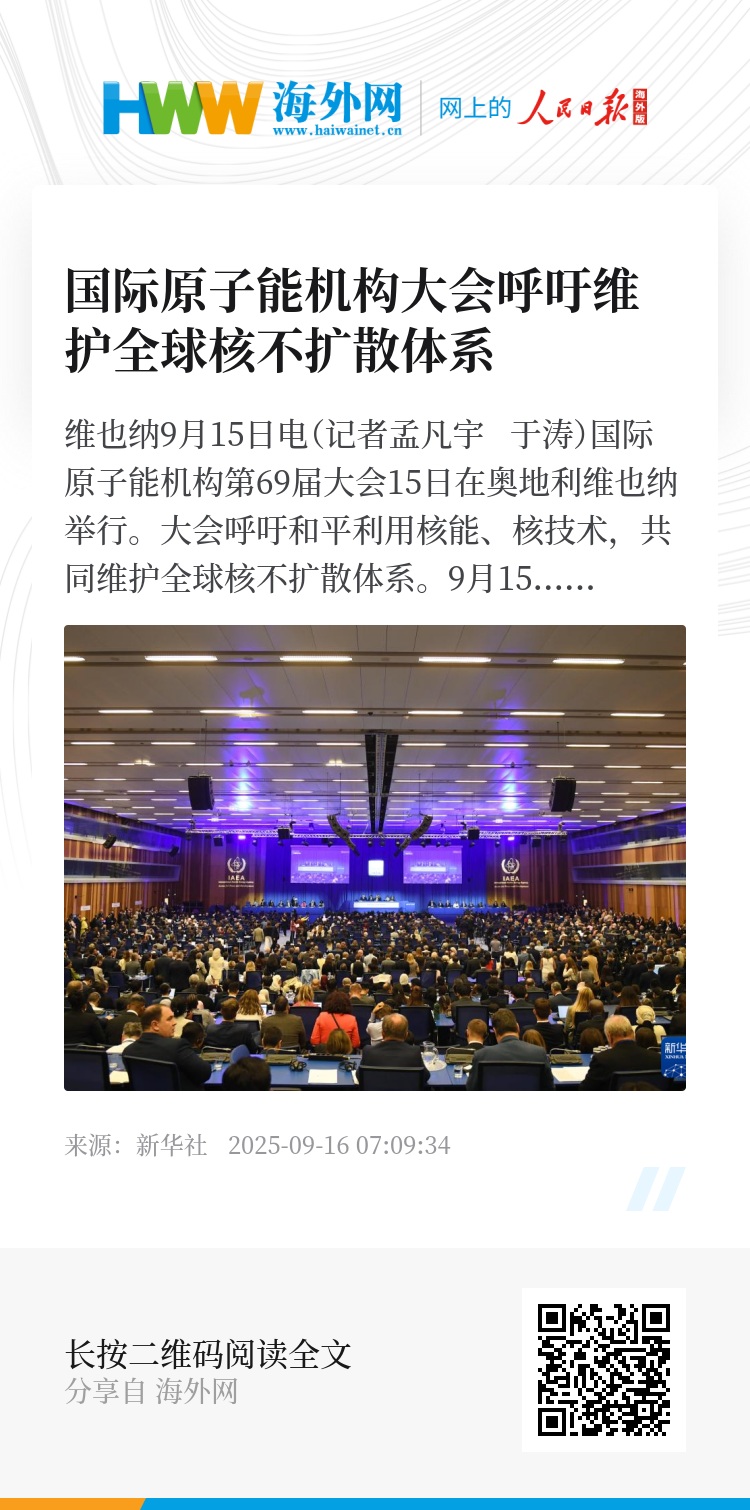 新华社维也纳9月15日电(记者孟凡宇 于涛)国际原子能机构第69届大会15日在奥地利维也纳举行。大会呼吁和平利用核能、核技术,共同维护全球核不扩散体系。