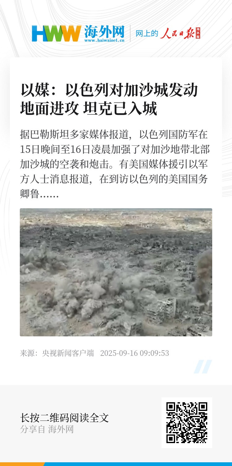 另据以色列媒体报道,以色列军方15日夜间对加沙城发动地面进攻。以军方坦克已进入加沙城。