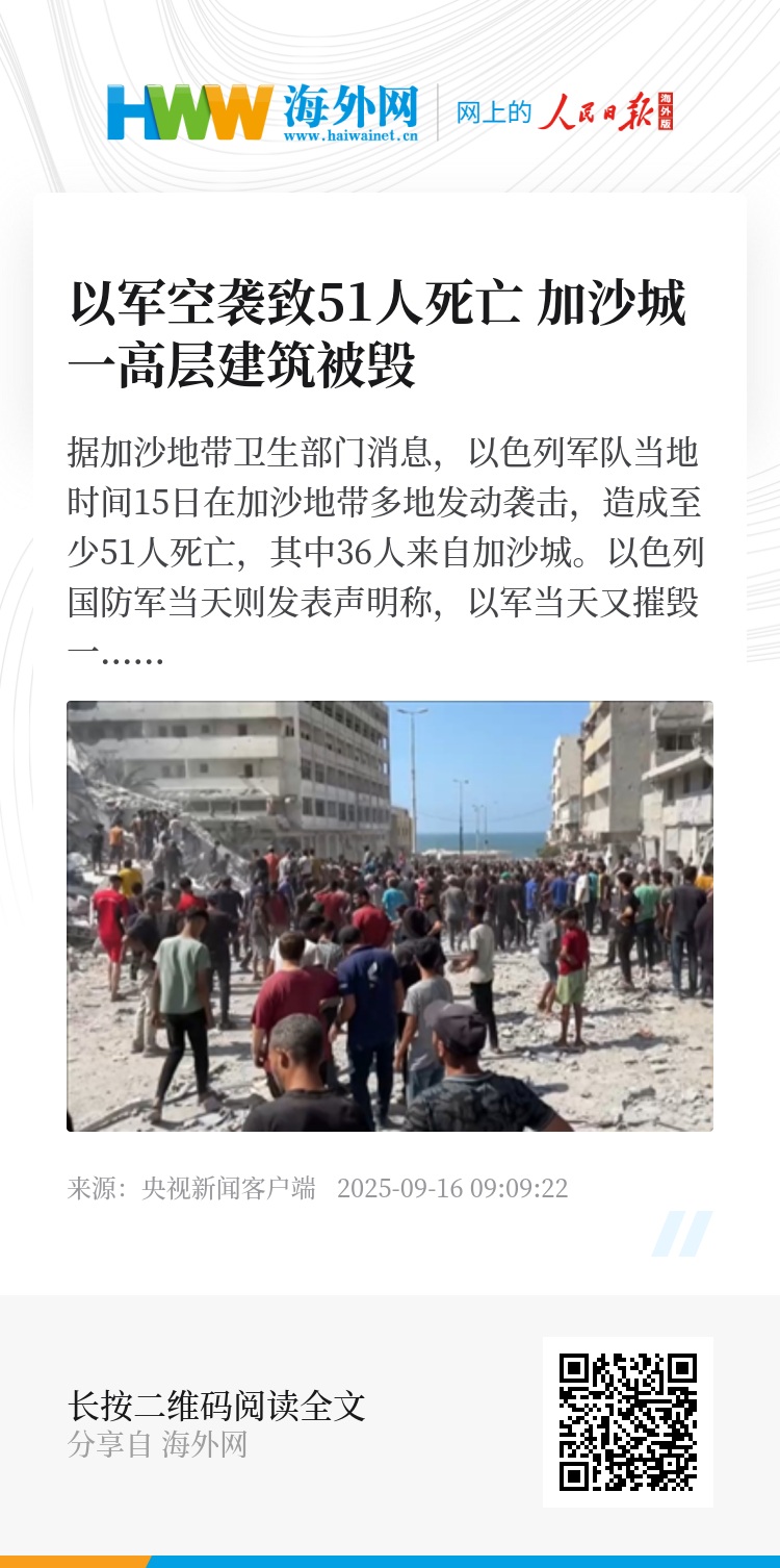 据加沙地带卫生部门消息,以色列军队当地时间15日在加沙地带多地发动袭击,造成至少51人死亡,其中36人来自加沙城。以色列国防军当天则发表声明称,以军当天又摧毁一栋位于加沙城的高层建筑。