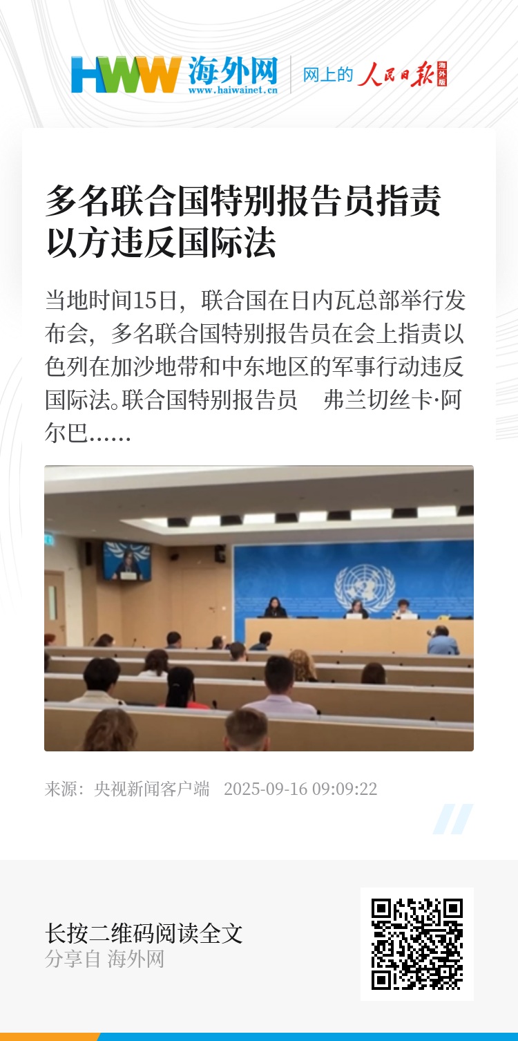 当地时间15日,联合国在日内瓦总部举行发布会,多名联合国特别报告员在会上指责以色列在加沙地带和中东地区的军事行动违反国际法。