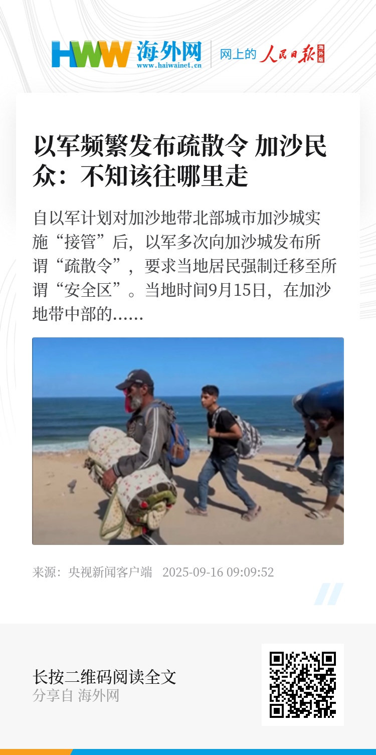 自以军计划对加沙地带北部城市加沙城实施“接管”后,以军多次向加沙城发布所谓“疏散令”,要求当地居民强制迁移至所谓“安全区”。当地时间9月15日,在加沙地带中部的沿海公路上,挤满了从加沙地带北部向南部逃亡的流离失所者。