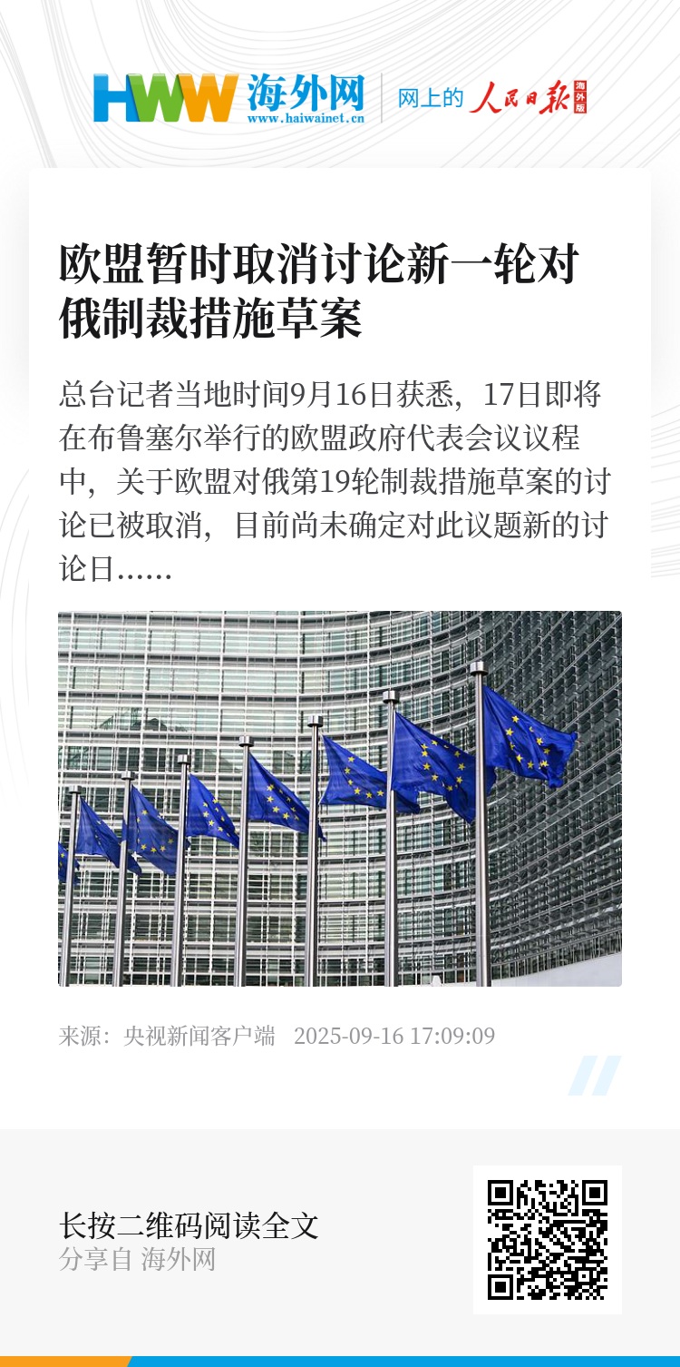 总台记者当地时间9月16日获悉,17日即将在布鲁塞尔举行的欧盟政府代表会议议程中,关于欧盟对俄第19轮制裁措施草案的讨论已被取消,目前尚未确定对此议题新的讨论日期。(总台记者 刘婵娟)