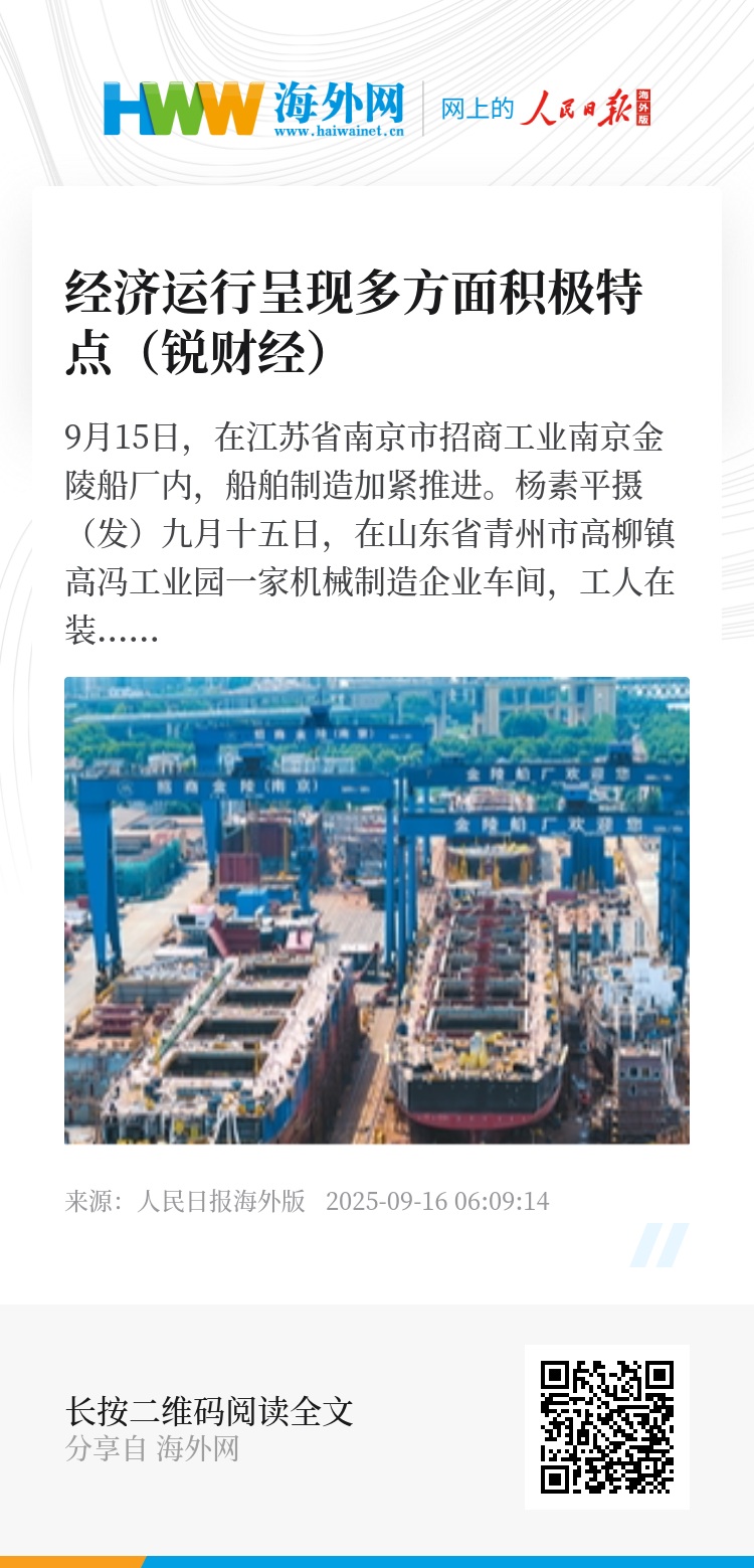 中央财经大学中国宏观发展研究院副院长俞剑对本报记者说,从8月份宏观经济数据来看,国家在消费、投资、人工智能等方面的政策效应正在持续显现。特别是消费和投资两端同时发力,形成了稳需求与促生产的良性循环。与此同时,“人工智能+”行动不断推进,也有利于数字经济稳步向好发展。总体看,政策“组合拳”为全年经济发展提供了有力支撑。