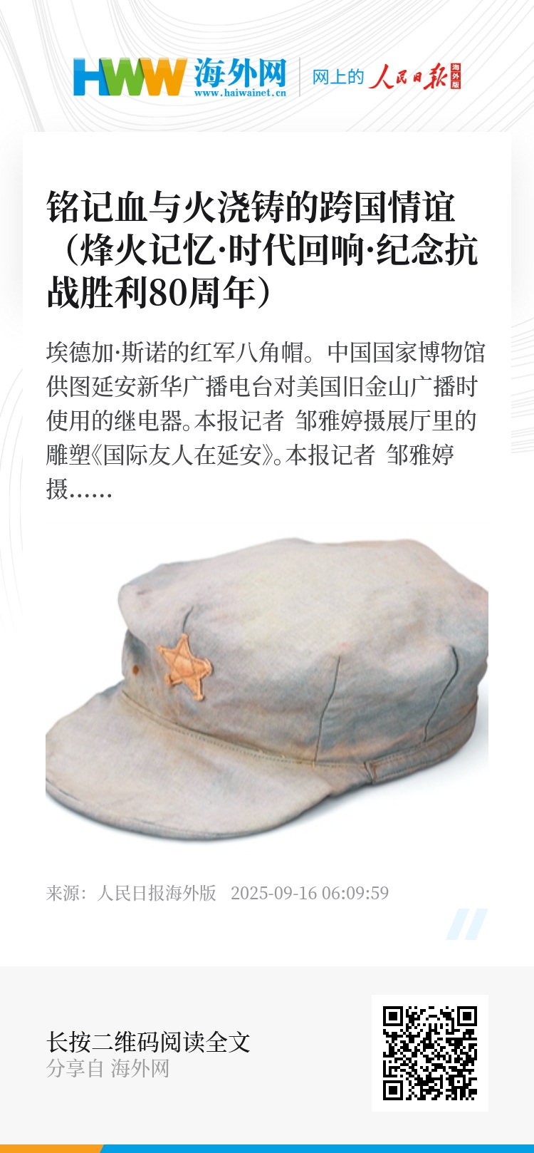 埃德加·斯诺的红军八角帽、“飞虎队”飞行员穿过的军服、白求恩的《自画像》……近日,由国家文物局、国家档案局、中国国家博物馆主办的“国际友人与中国抗战——纪念中国人民抗日战争暨世界反法西斯战争胜利80周年”专题展在国博开幕。