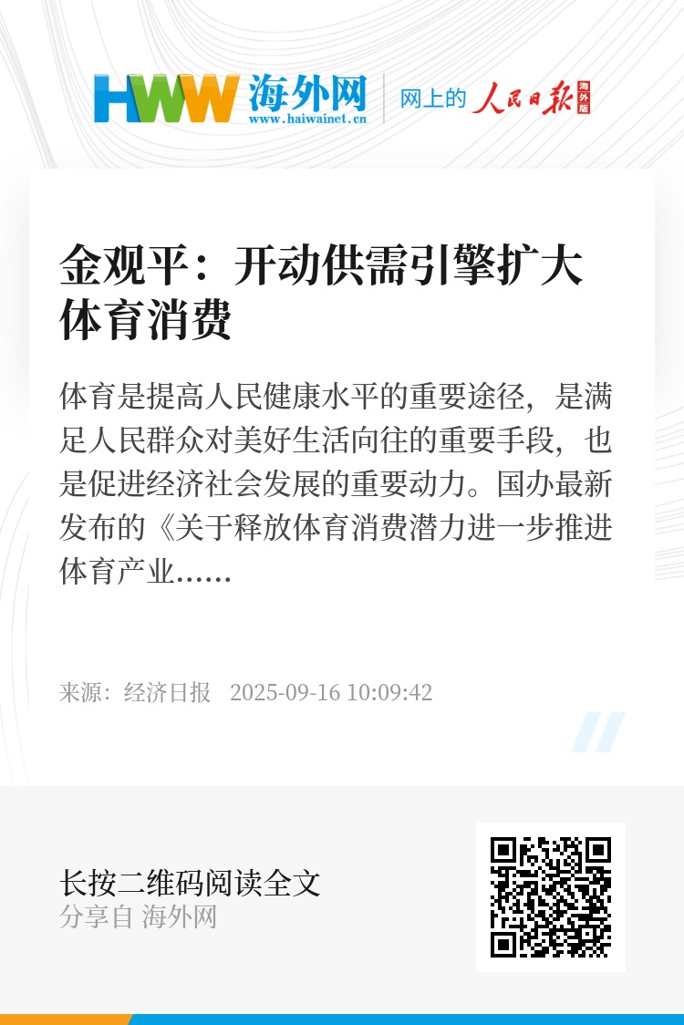 体育承载着国家强盛、民族复兴的梦想,也关系着人民群众的健康幸福和生活的丰富多彩。各方要以更大力度、更实举措推动体育消费提质扩容,为推动体育产业发展、体育强国建设注入强劲动能。(作者:金观平 来源:经济日报)