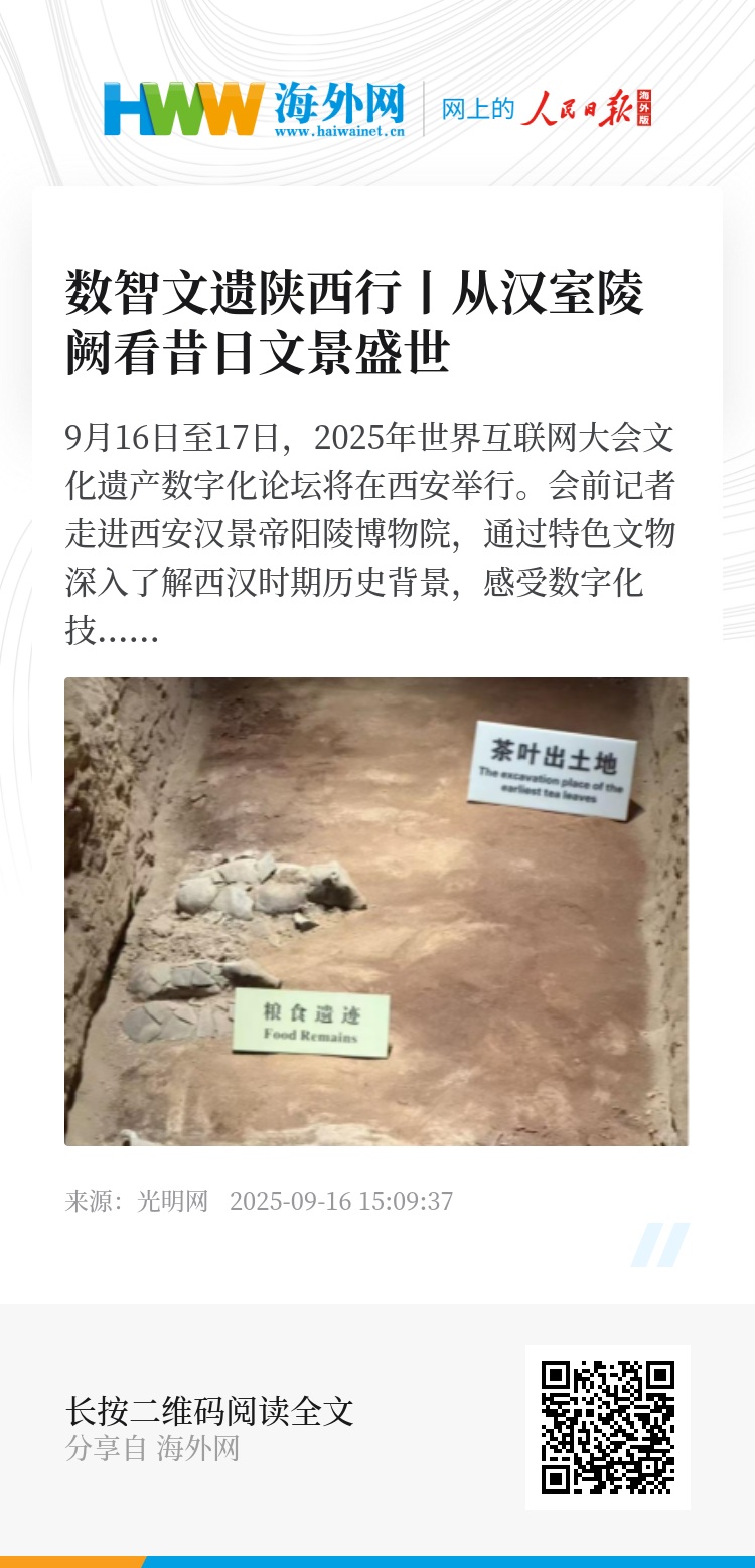 9月16日至17日,2025年世界互联网大会文化遗产数字化论坛将在西安举行。会前记者走进西安汉景帝阳陵博物院,通过特色文物深入了解西汉时期历史背景,感受数字化技术、IP形象塑造与文博考古事业的深度融合。