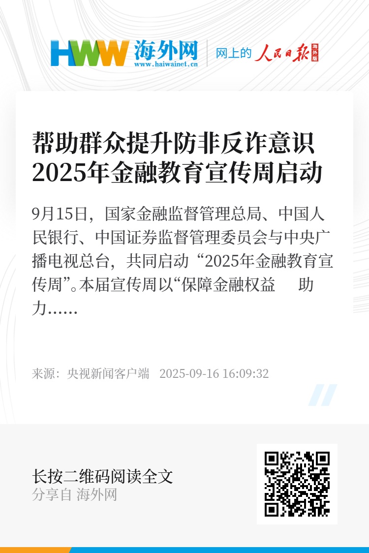9月15日,国家金融监督管理总局、中国人民银行、中国证券监督管理委员会与中央广播电视总台,共同启动“2025年金融教育宣传周”。