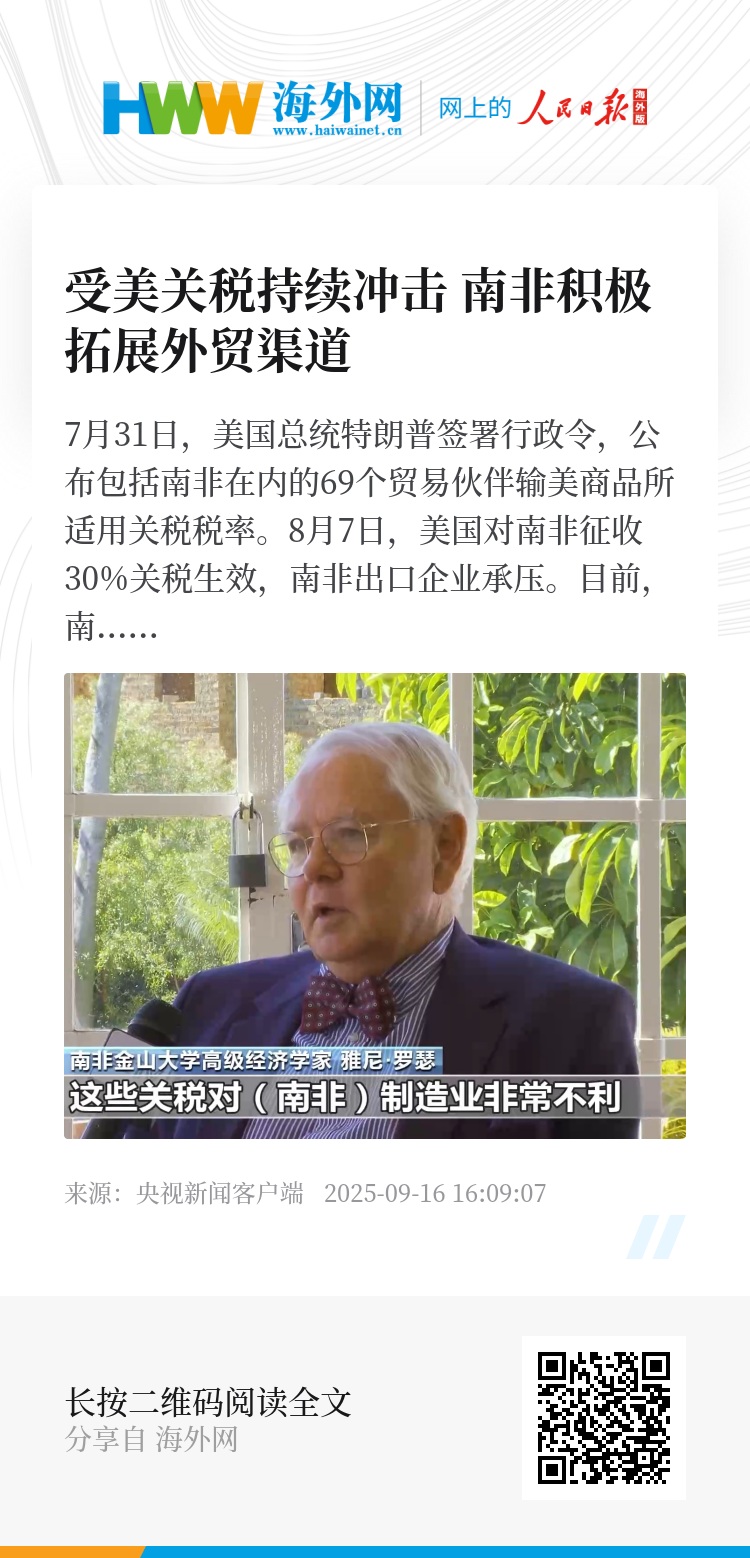 7月31日,美国总统特朗普签署行政令,公布包括南非在内的69个贸易伙伴输美商品所适用关税税率。8月7日,美国对南非征收30%关税生效,南非出口企业承压。目前,南非政府和工商界在积极拓展外贸多元化发展。