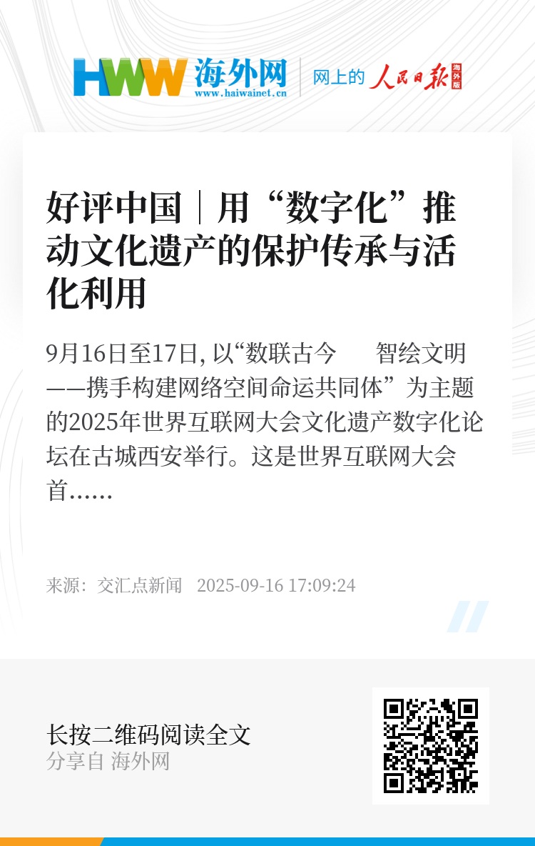 9月16日至17日,以“数联古今 智绘文明——携手构建网络空间命运共同体”为主题的2025年世界互联网大会文化遗产数字化论坛在古城西安举行。这是世界互联网大会首次聚焦“文化遗产数字化”专题论坛。数字化与我们当下的生活息息相关,不仅关乎经济社会的转型升级,更在文化遗产保护与文明传承中展现出不可替代的重要意义。
