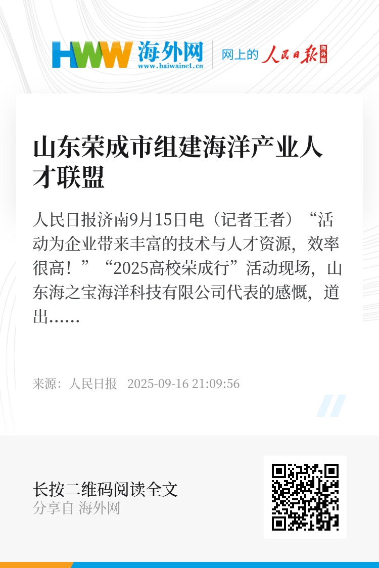 人民日报济南9月15日电(记者王者)“活动为企业带来丰富的技术与人才资源,效率很高!”“2025高校荣成行”活动现场,山东海之宝海洋科技有限公司代表的感慨,道出山东荣成海洋经济发展的新活力。在活动中,47所高校代表与87家重点企业面对面交流,8所高校“就业和人才引育合作基地”揭牌,达成40余个合作意向。