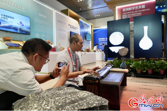 工作人员在亚洲数字艺术展文化遗产古琴与钧瓷交互项目“钧彩叠鸣”展位演奏古琴。光明网记者 赵金悦/摄