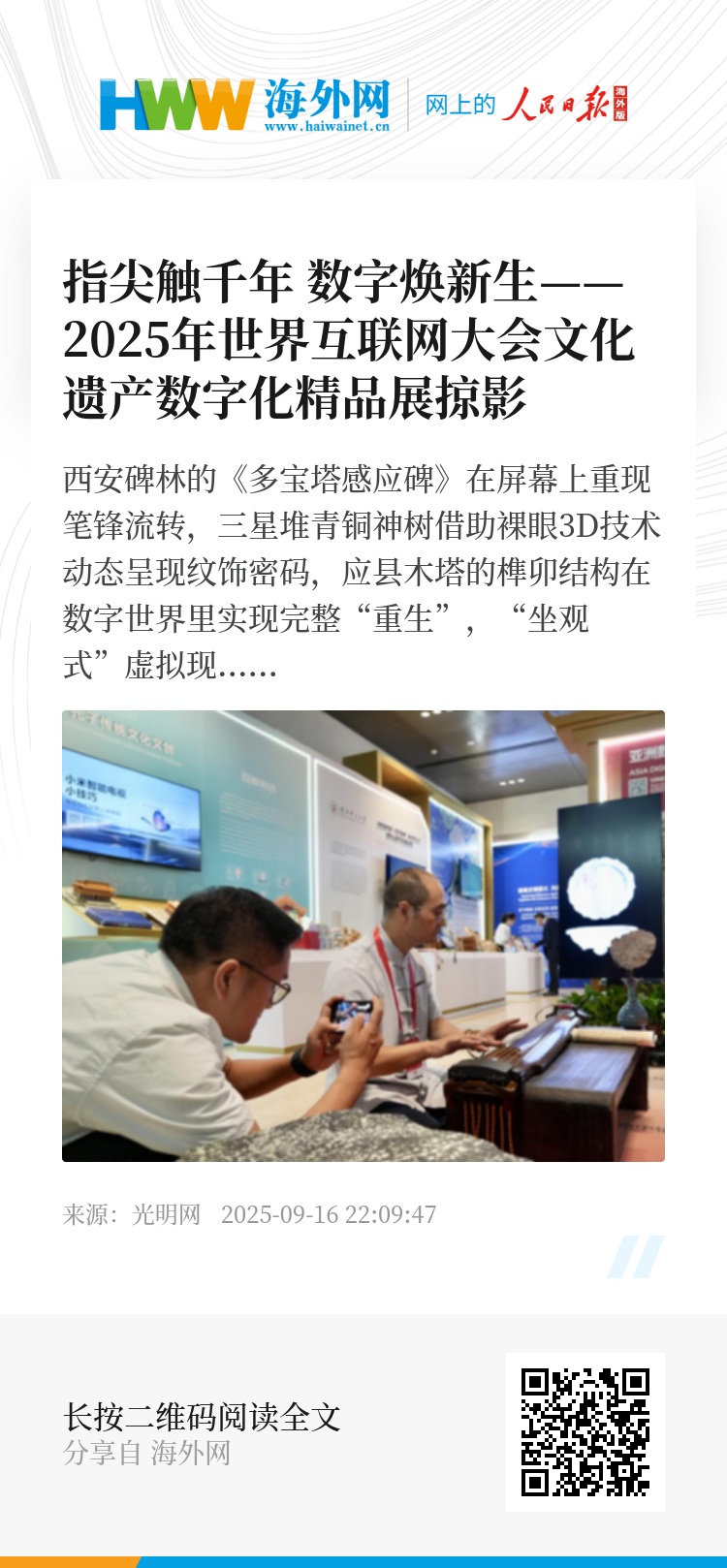 古籍“屏上重生”、文物“时空对话”、古建“数字孪生”、非遗“沉浸体验”……2025年世界互联网大会文化遗产数字化精品展,不仅是一场科技与文化交融的盛宴,更是对文明传承探索的创新实践。数字技术正拂去历史尘埃,连古今、通中外,助力文化遗产走进生活、助力互鉴。(光明网记者 雷渺鑫 张晨昊 熊健)