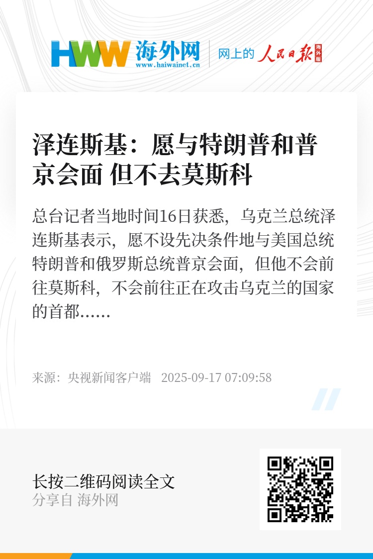 总台记者当地时间16日获悉,乌克兰总统泽连斯基表示,愿不设先决条件地与美国总统特朗普和俄罗斯总统普京会面,但他不会前往莫斯科,不会前往正在攻击乌克兰的国家的首都。