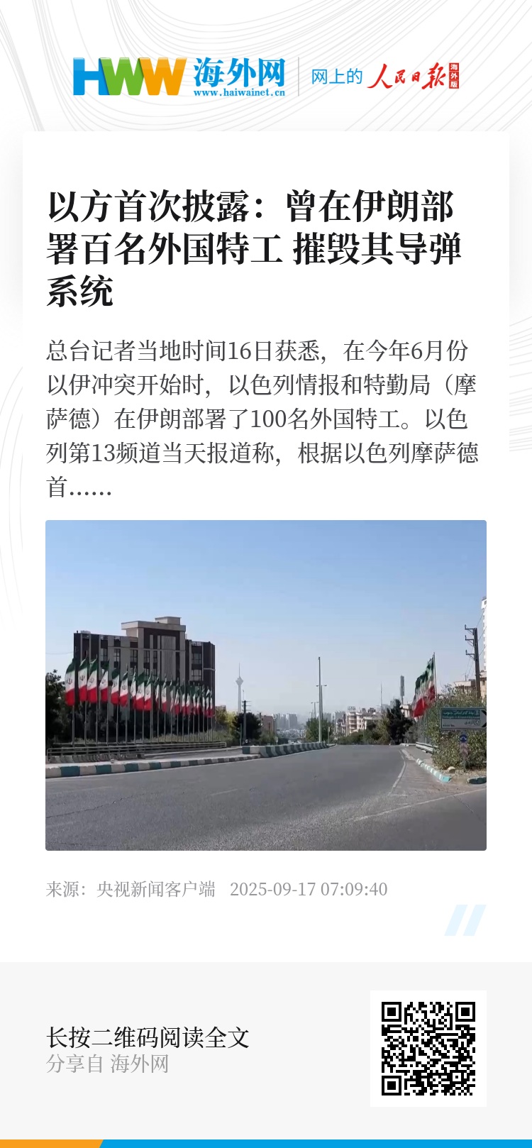 总台记者当地时间16日获悉,在今年6月份以伊冲突开始时,以色列情报和特勤局(摩萨德)在伊朗部署了100名外国特工。