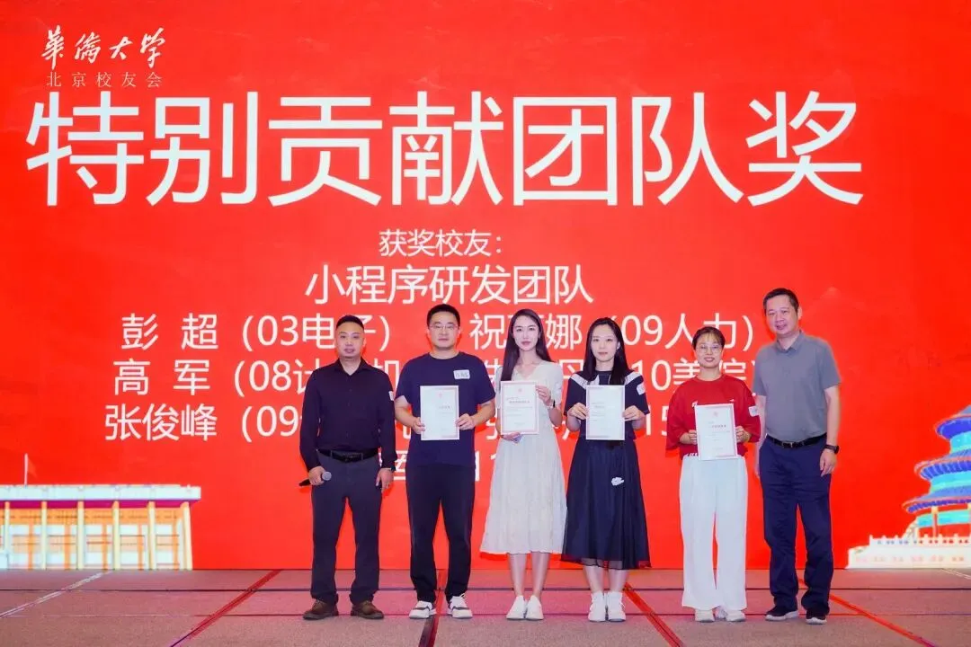华侨大学校友工作办公室主任洪雪辉为小程序研发团队颁发特别贡献团队奖;小程序研发团队成员包括03级电科彭超、08级计算机高军、09级人力祝丽娜、09级计算机张俊峰、10级美院朱丹丹、11级瞿贵军、15级土木张钟丹。