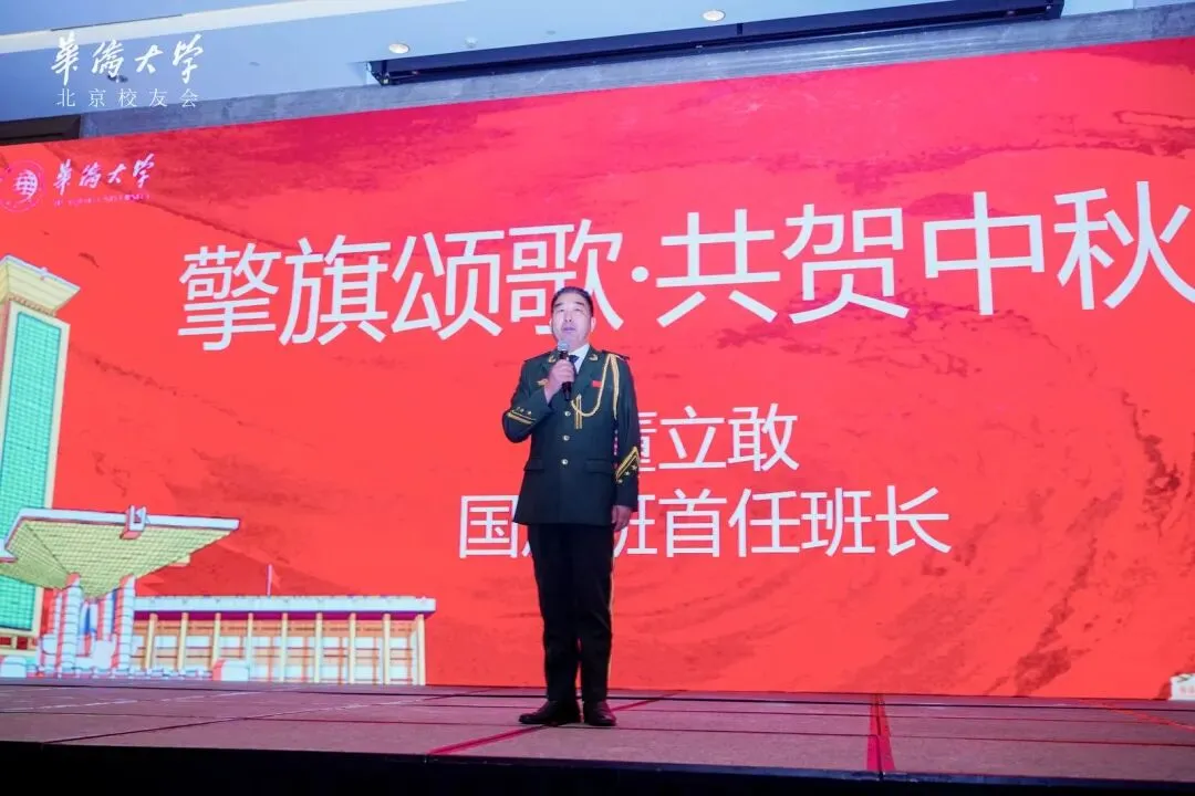 今年正值反法西斯胜利 80 周年,北京校友会为此特别策划了独具意义的开场环节 —— 由获党中央、国务院授予 “国旗卫士” 荣誉称号的天安门国旗班首任班长董立敢,带领六位校友护旗手,现场展示了一面曾在天安门广场飘扬过的五星红旗;董立敢班长还深情讲述了这面国旗背后的故事,全体校友共同唱响国歌。这庄严动人的一幕,也为此次活动赋予了别样的意义与更高的精神内涵。