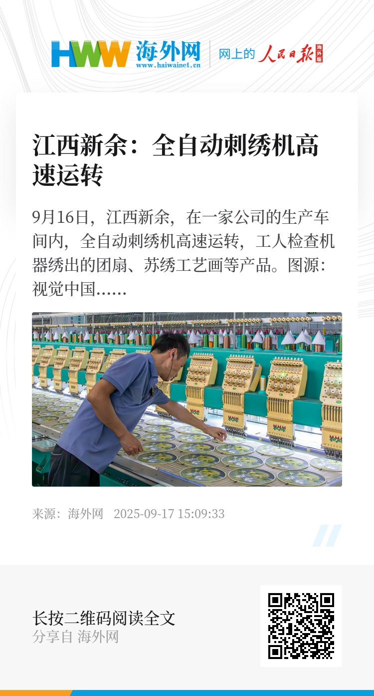 32894951,.江西新余:全自动刺绣机高速运转,.2025-09-17 15:43:33,.204309,.陈亚楠、王珊宁