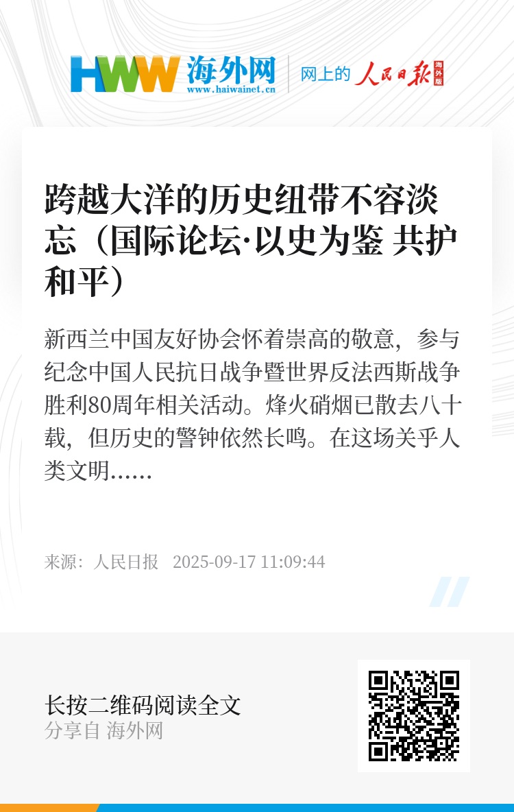 从战火纷飞的年代,到携手合作的今天,新中两国人民的友谊生动诠释了人类命运共同体的理念。让我们继承先辈遗志,推动友谊之船驶向更广阔的远方,让人类命运共同体的光芒照亮文明的天空。(麦克·道森 作者为新西兰中国友好协会主席)