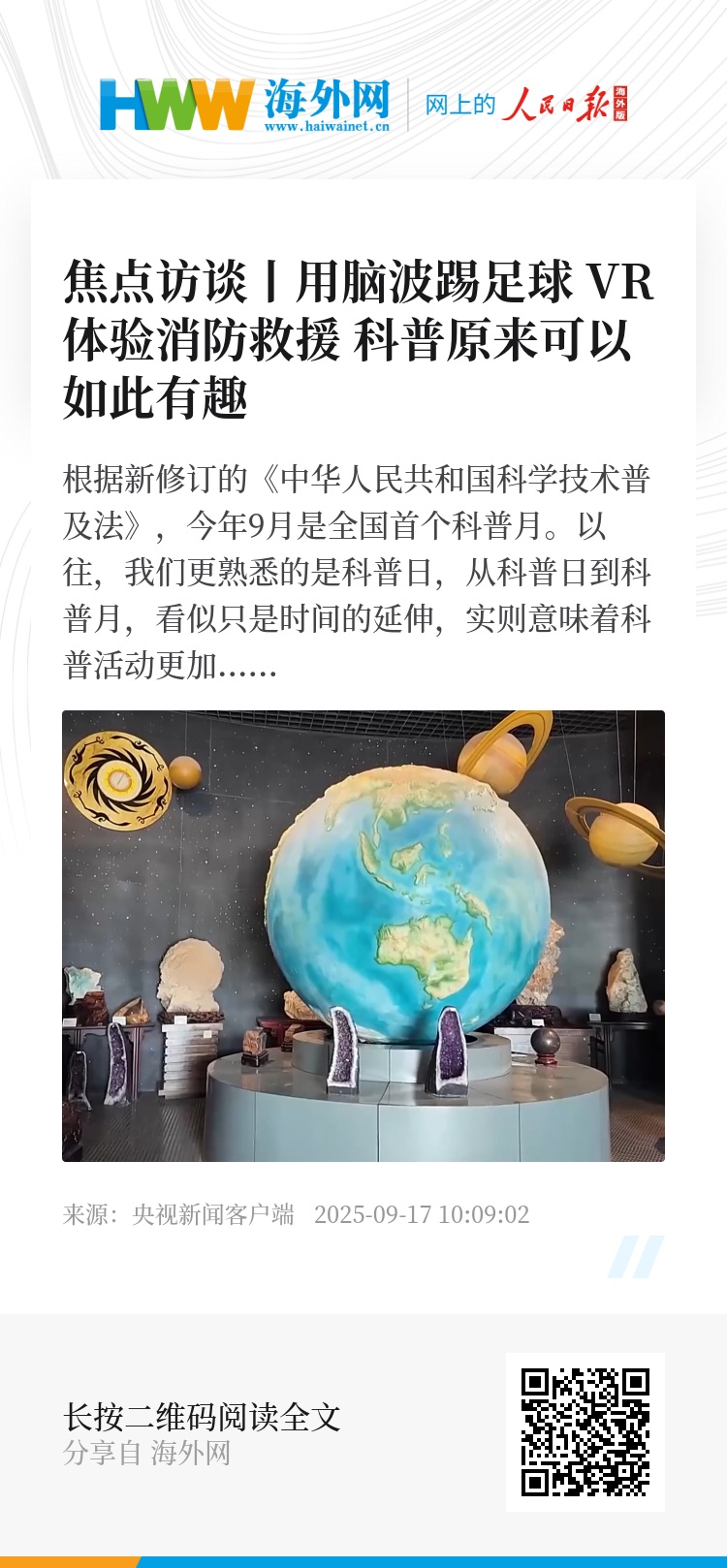 根据新修订的《中华人民共和国科学技术普及法》,今年9月是全国首个科普月。以往,我们更熟悉的是科普日,从科普日到科普月,看似只是时间的延伸,实则意味着科普活动更加丰富多元,从而更好地提升全民科学素质,在全社会营造出浓厚的科学氛围,助力科技强国建设。今年的科普月期间,很多地方和部门都开展了内容丰富、形式多样的科普活动,像科普讲座、展览、互动体验等等,把科普送到更多人的身边。我们首先到中国科技馆去看看。