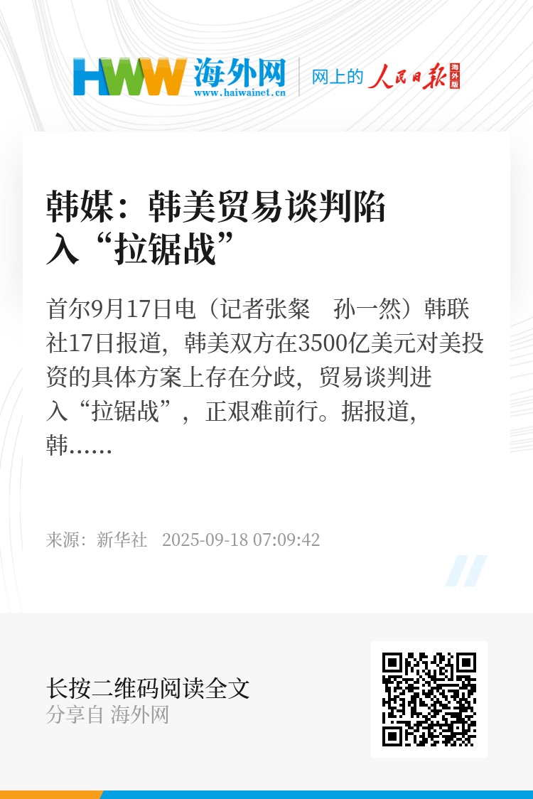 新华社首尔9月17日电(记者张粲 孙一然)韩联社17日报道,韩美双方在3500亿美元对美投资的具体方案上存在分歧,贸易谈判进入“拉锯战”,正艰难前行。