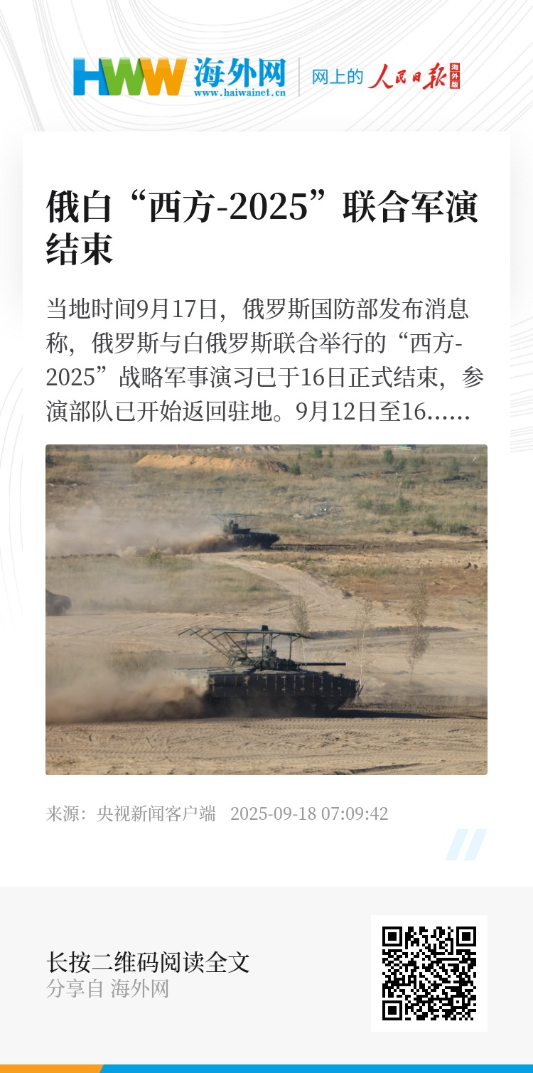 当地时间9月17日,俄罗斯国防部发布消息称,俄罗斯与白俄罗斯联合举行的“西方-2025”战略军事演习已于16日正式结束,参演部队已开始返回驻地。