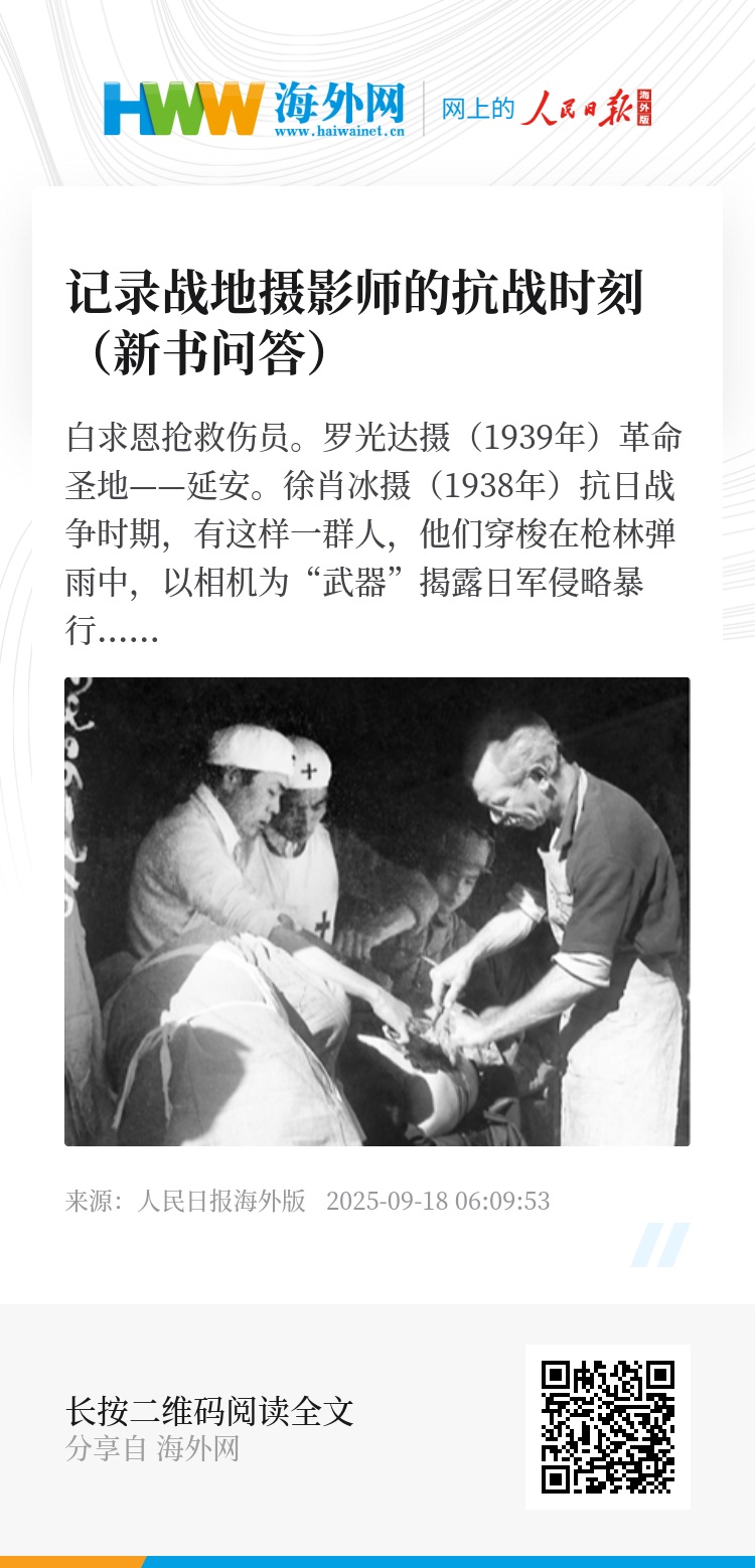 答:战地摄影师对抗战的贡献是无法量化的,通过他们的艰苦工作,战场与后方、苦难与牺牲、坚守与抵抗,得以被串联成一条清晰的动线,最终让一个时代的奉献与抗争,有了具体可感、震撼人心的视觉呈现。他们拍摄的许多照片具有重要的史料价值。比如俞创硕拍摄的一张名为《平型关大捷后归来》的照片,忠实记录了1937年平型关大捷后,八路军战士带着战利品凯旋的场景;1939年,罗光达镜头里的白求恩大夫为八路军伤员治病,定格下人道主义的大爱……他们无不用影像抵抗遗忘,用镜头传递信念。(本报记者 张鹏禹)