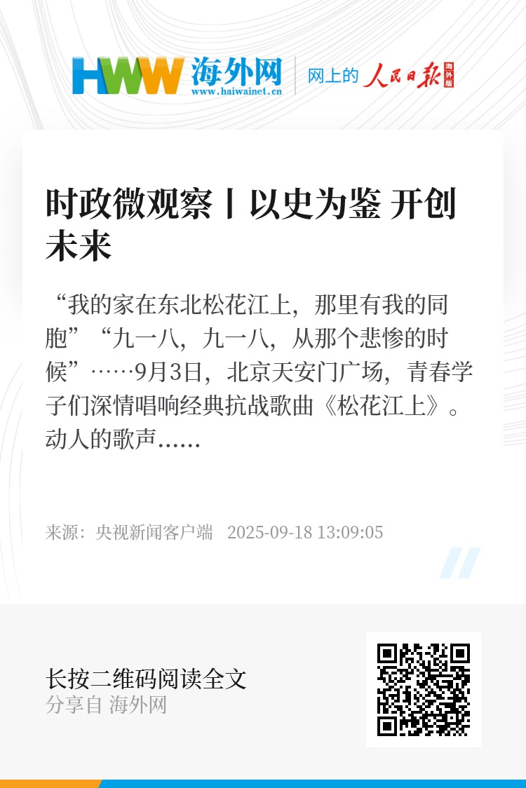 “我的家在东北松花江上,那里有我的同胞”“九一八,九一八,从那个悲惨的时候”……9月3日,北京天安门广场,青春学子们深情唱响经典抗战歌曲《松花江上》。动人的歌声响彻神州大地,唱进亿万中华儿女心中。