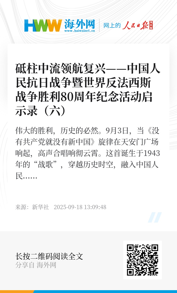 “中国共产党的中流砥柱作用是中国人民抗日战争胜利的关键。”“中国人民抗日战争胜利是中国共产党发挥中流砥柱作用的伟大胜利。”这是历史的结论,也是人民的心声。