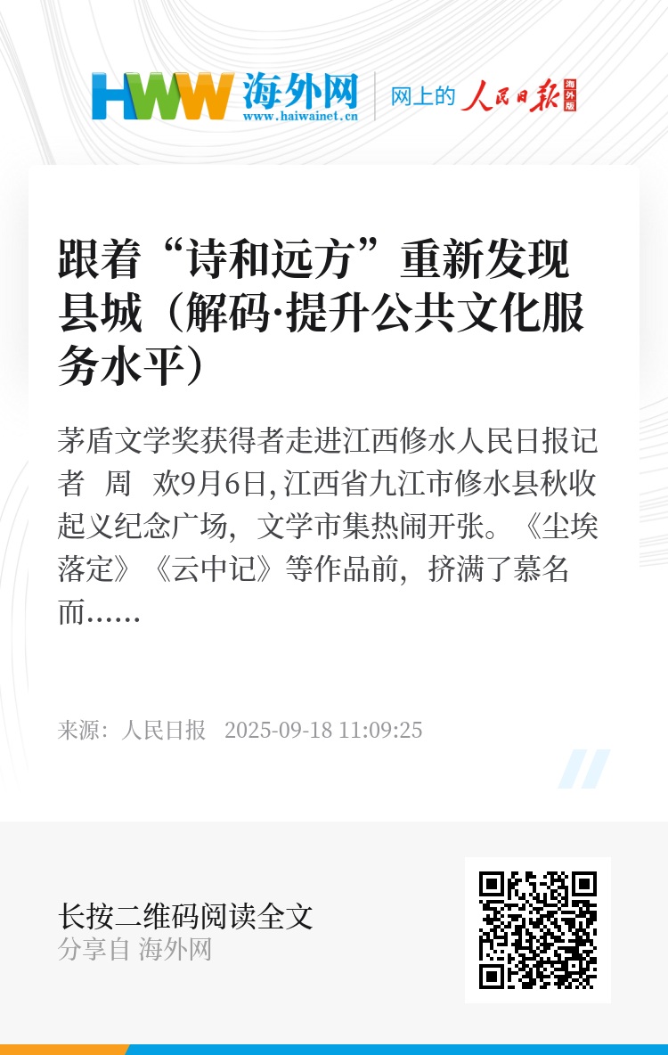 修水是一座文化底蕴深厚的县城。北宋年间,诗人黄庭坚从这里走出。建设作家创作基地、开发“跟着诗词游修水”旅游路线……近年来,修水推动文旅和文学相融合,打造“诗与远方”旅游目的地,文学正为县域经济发展注入新动能。