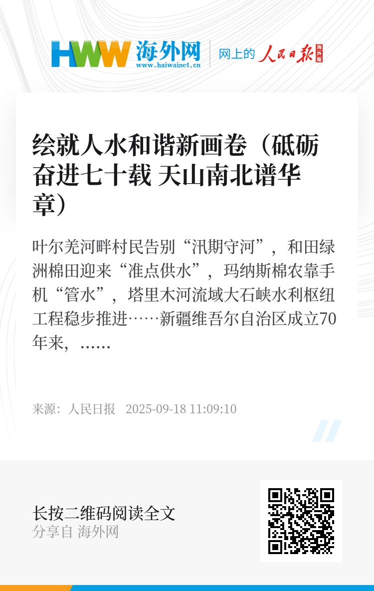 建成671座水库、12.54万公里干支斗渠、逾8000公里堤防护岸,灌溉面积达9917万亩,农村自来水普及率达99%,塔里木河下游生态输水累计超98亿立方米……新疆维吾尔自治区水利厅党组成员、副厅长焦全喜介绍,新疆水利系统正以“节水优先、空间均衡、系统治理、两手发力”的治水思路,持续深化水资源集中统一管理,为续写水润天山的新篇章提供更多助力。(记者 胡仁巴 邓剑洋 韩立群)