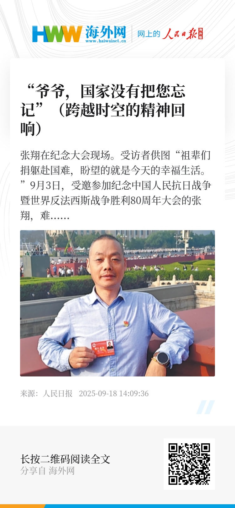 “祖辈们捐躯赴国难,盼望的就是今天的幸福生活。”9月3日,受邀参加纪念中国人民抗日战争暨世界反法西斯战争胜利80周年大会的张翔,难掩内心激动,“爷爷,国家没有把您忘记!”
