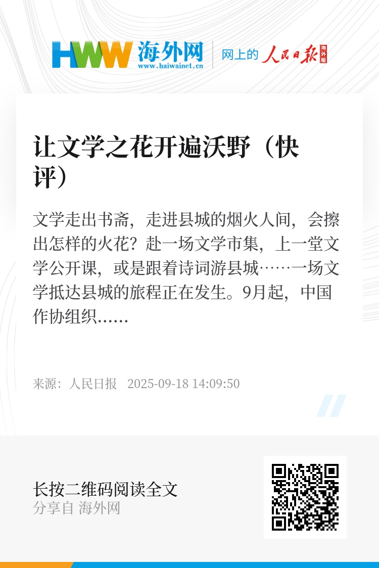 文学的生命力,永远扎根于最广阔的现场。以文学名家的眼睛发现县城之美,用文学的力量打开县域新的发展机遇。期待更多优质文化资源直达基层,让文学之花开遍沃野,探索出文学赋能地方发展的新路径。(陈圆圆)