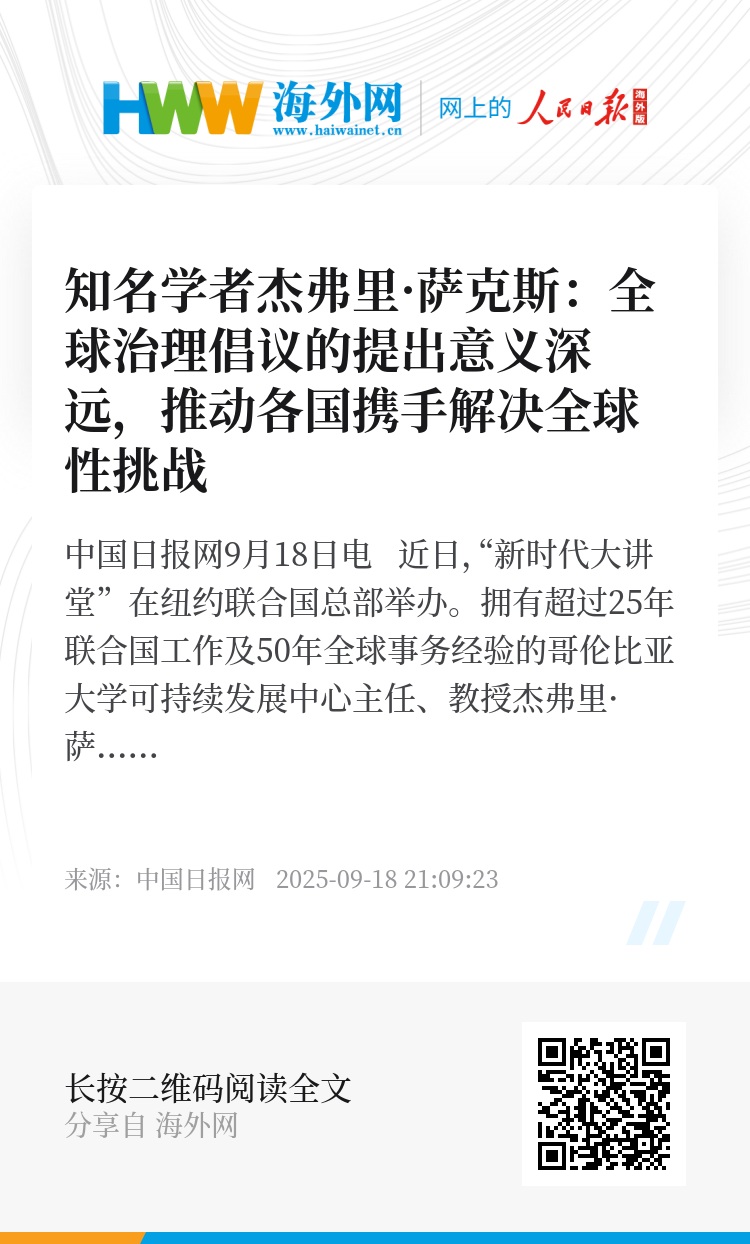 中国日报网9月18日电 近日,“新时代大讲堂”在纽约联合国总部举办。拥有超过25年联合国工作及50年全球事务经验的哥伦比亚大学可持续发展中心主任、教授杰弗里·萨克斯在演讲中强调,联合国应坚守多边主义原则,切实强化全球合作。他同时指出,中国提出的全球治理倡议对国际合作作出了重要贡献,“具有广泛而深远的意义,能推动世界各国携手合作、共同解决问题”。