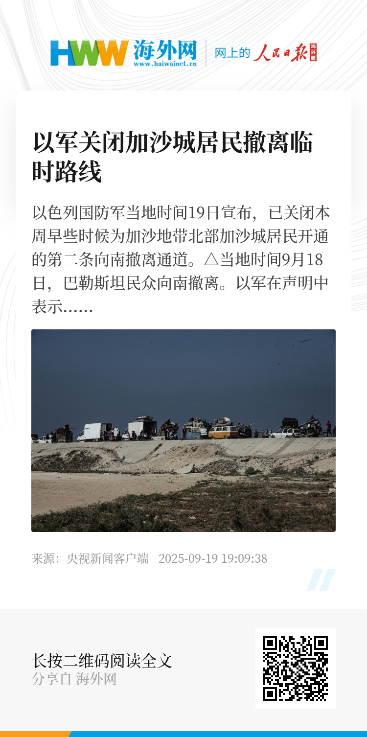 以色列国防军当地时间19日宣布,已关闭本周早些时候为加沙地带北部加沙城居民开通的第二条向南撤离通道。