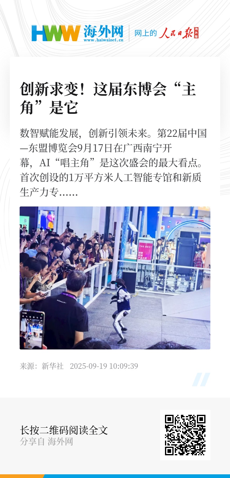 第22届中国—东盟博览会9月17日在广西南宁开幕,AI“唱主角”是这次盛会的最大看点。首次创设的1万平方米人工智能专馆和新质生产力专馆,是东博会献给数字时代的“智慧客厅”。