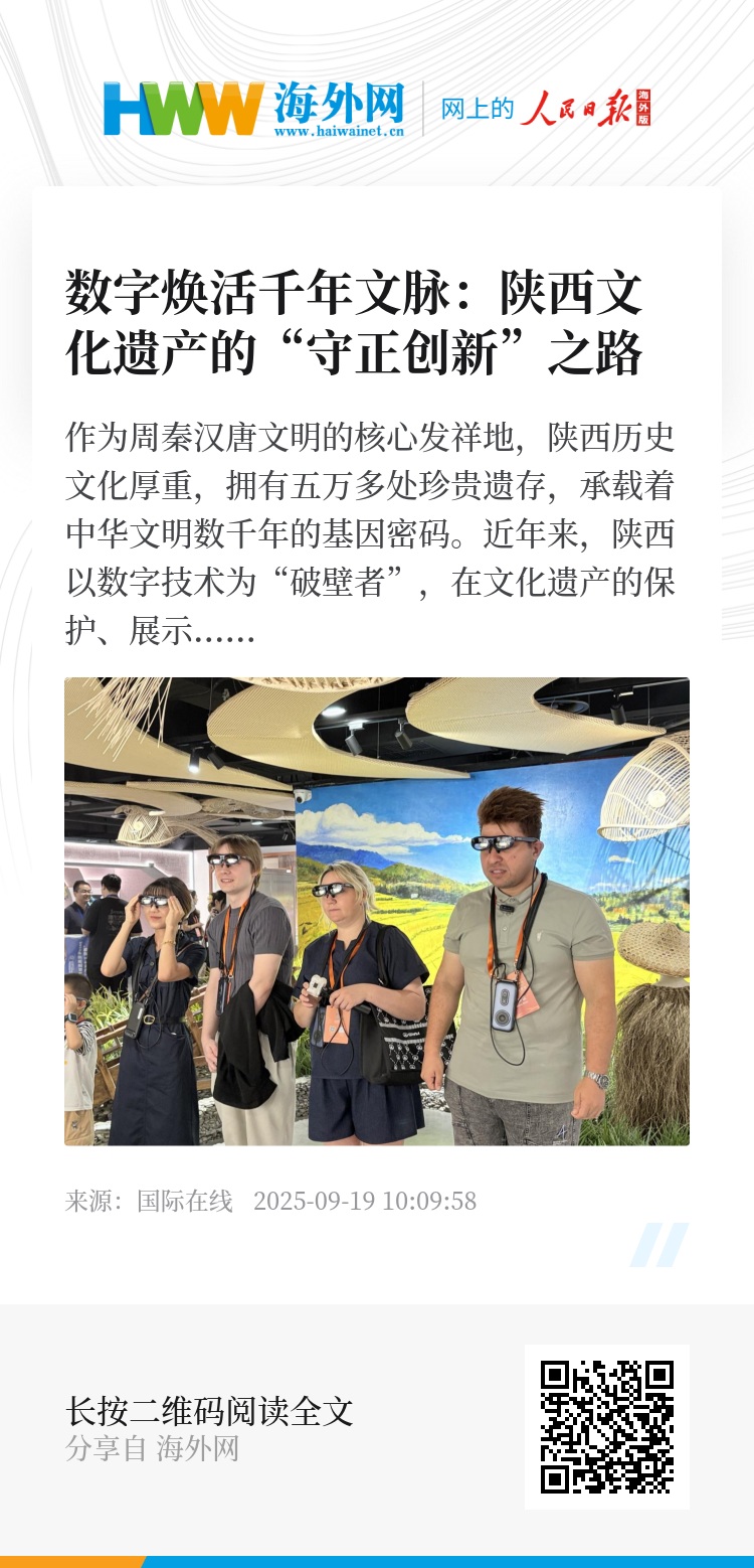 如今,陕西已将文脉数字化延伸至线上线下融合:部分博物馆的数字展品可生成二维码,游客扫码就能获取详细的历史解读;在线上博物馆,用户可随时随地浏览高清文物图片、观看历史科普视频。数字技术正在让陕西的历史文脉变得“触手可及”,不仅让本土民众更了解家乡文化,也让海外友人能跨越语言与地域障碍,感受中华文明的深厚底蕴。