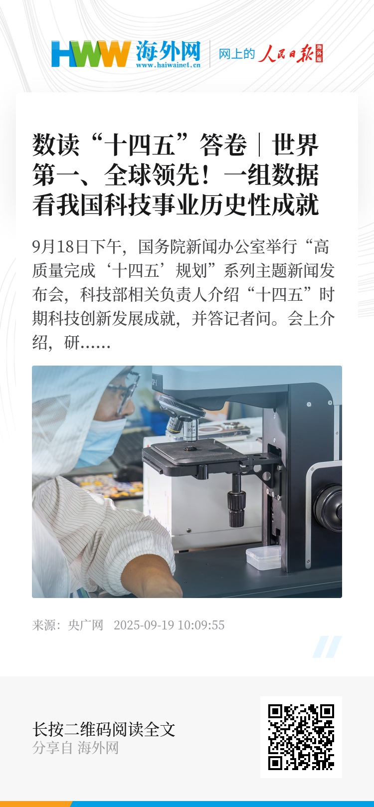 9月18日下午,国务院新闻办公室举行“高质量完成‘十四五’规划”系列主题新闻发布会,科技部相关负责人介绍“十四五”时期科技创新发展成就,并答记者问。会上介绍,研发人员总量世界第一,高水平国际期刊论文数量和国际专利申请量连续5年世界第一,“灯塔工厂”数量全球第一……戳图!一组数据看我国科技事业历史性成就!