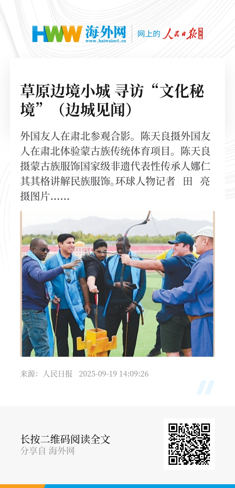 在历史长河中,肃北这座边境小城守护着独有的文化形态。而今,文化交流正让这座边城蕴藏的“文化宝库”在传承中迸发创新活力。独特的人文风情,正成为吸引中外游客和推动与周边国家人文交流的桥梁和纽带。(环球人物记者 田 亮 人民日报记者 王锦涛 姜 波 环球时报记者 樊 巍)
