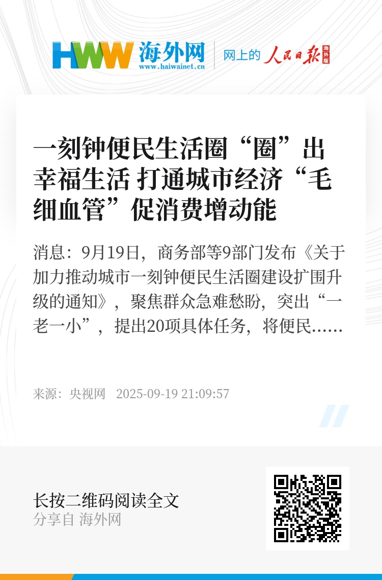 央视网消息:9月19日,商务部等9部门发布《关于加力推动城市一刻钟便民生活圈建设扩围升级的通知》,聚焦群众急难愁盼,突出“一老一小”,提出20项具体任务,将便民生活圈打造成宜居宜业、宜游宜购、宜老宜小的全龄友好型品质生活圈。