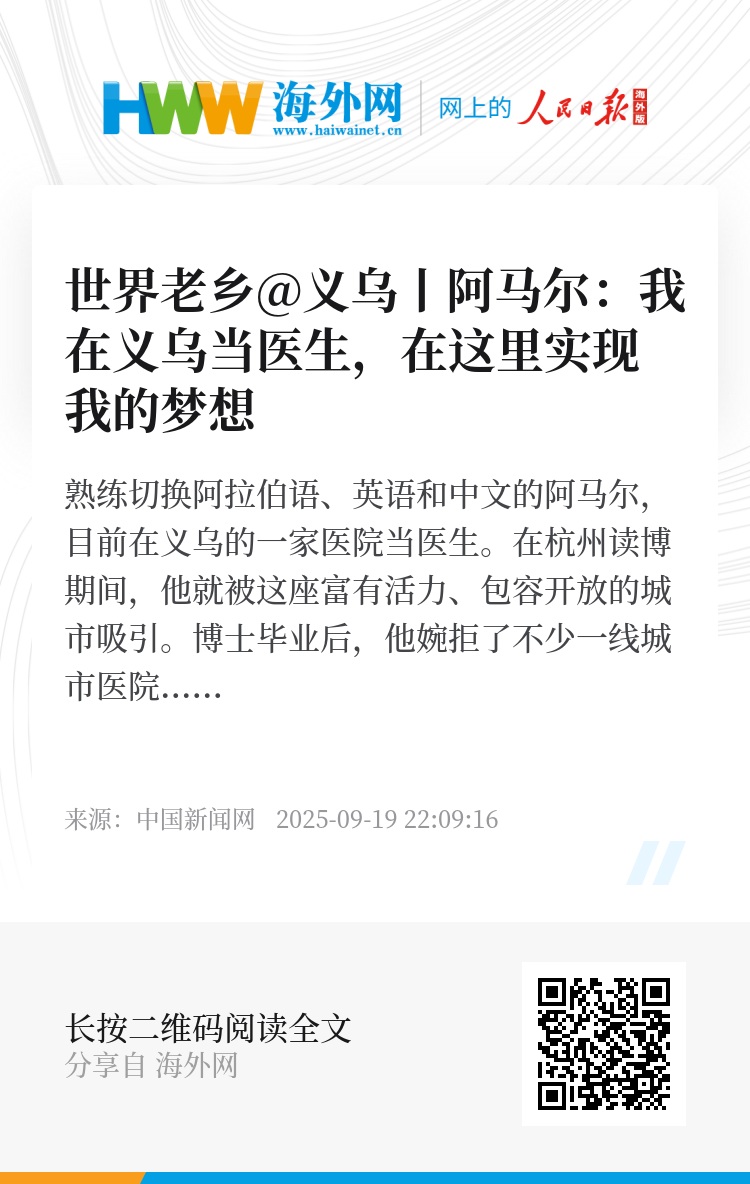 熟练切换阿拉伯语、英语和中文的阿马尔,目前在义乌的一家医院当医生。在杭州读博期间,他就被这座富有活力、包容开放的城市吸引。博士毕业后,他婉拒了不少一线城市医院的工作邀约,选择成为义乌的一名外籍医生,就像他说的,“义乌是能实现‘大梦想’的城市。”