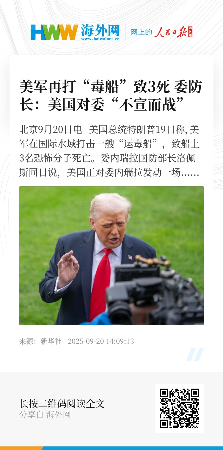 新华社北京9月20日电 美国总统特朗普19日称,美军在国际水域打击一艘“运毒船”,致船上3名恐怖分子死亡。委内瑞拉国防部长洛佩斯同日说,美国正对委内瑞拉发动一场“未经宣告的战争”。