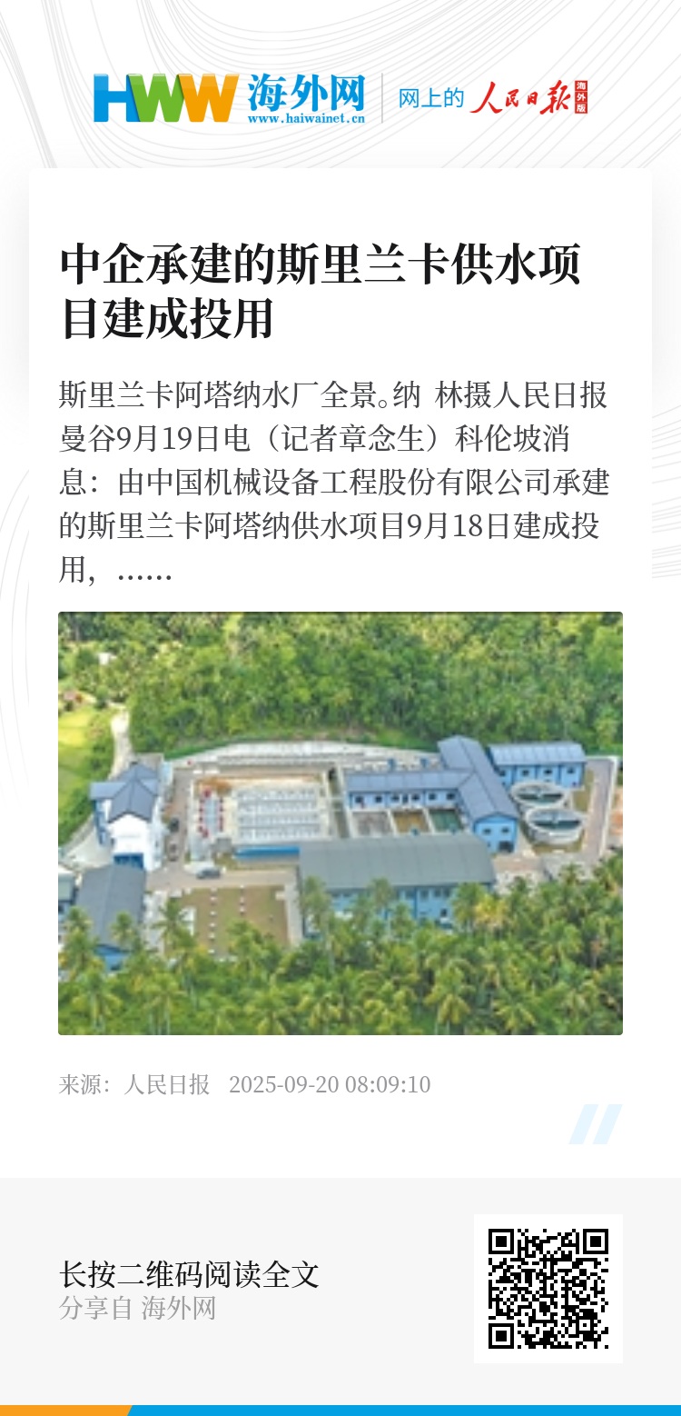 人民日报曼谷9月19日电(记者章念生)科伦坡消息:由中国机械设备工程股份有限公司承建的斯里兰卡阿塔纳供水项目9月18日建成投用,将为60多万当地居民提供可靠清洁水源。