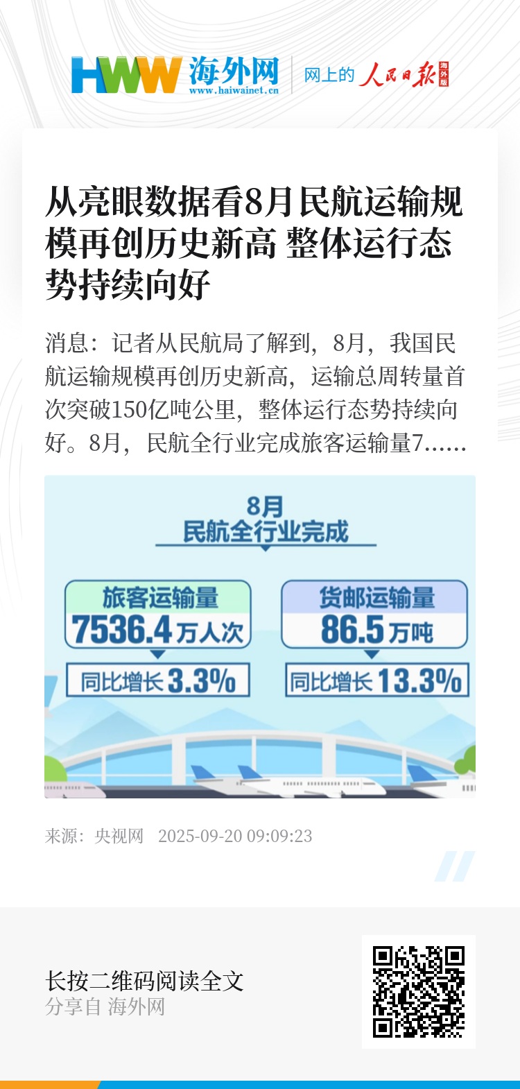 央视网消息:记者从民航局了解到,8月,我国民航运输规模再创历史新高,运输总周转量首次突破150亿吨公里,整体运行态势持续向好。