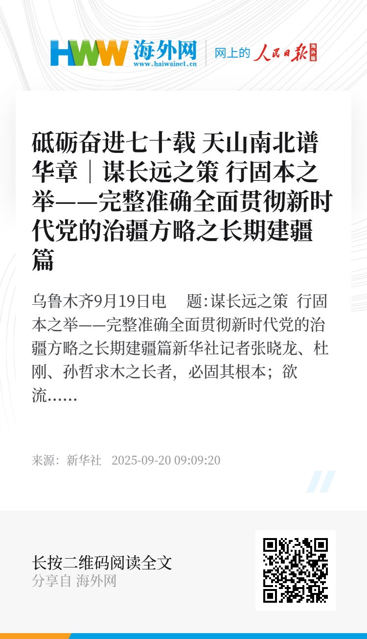 新华社乌鲁木齐9月19日电 题:谋长远之策 行固本之举——完整准确全面贯彻新时代党的治疆方略之长期建疆篇