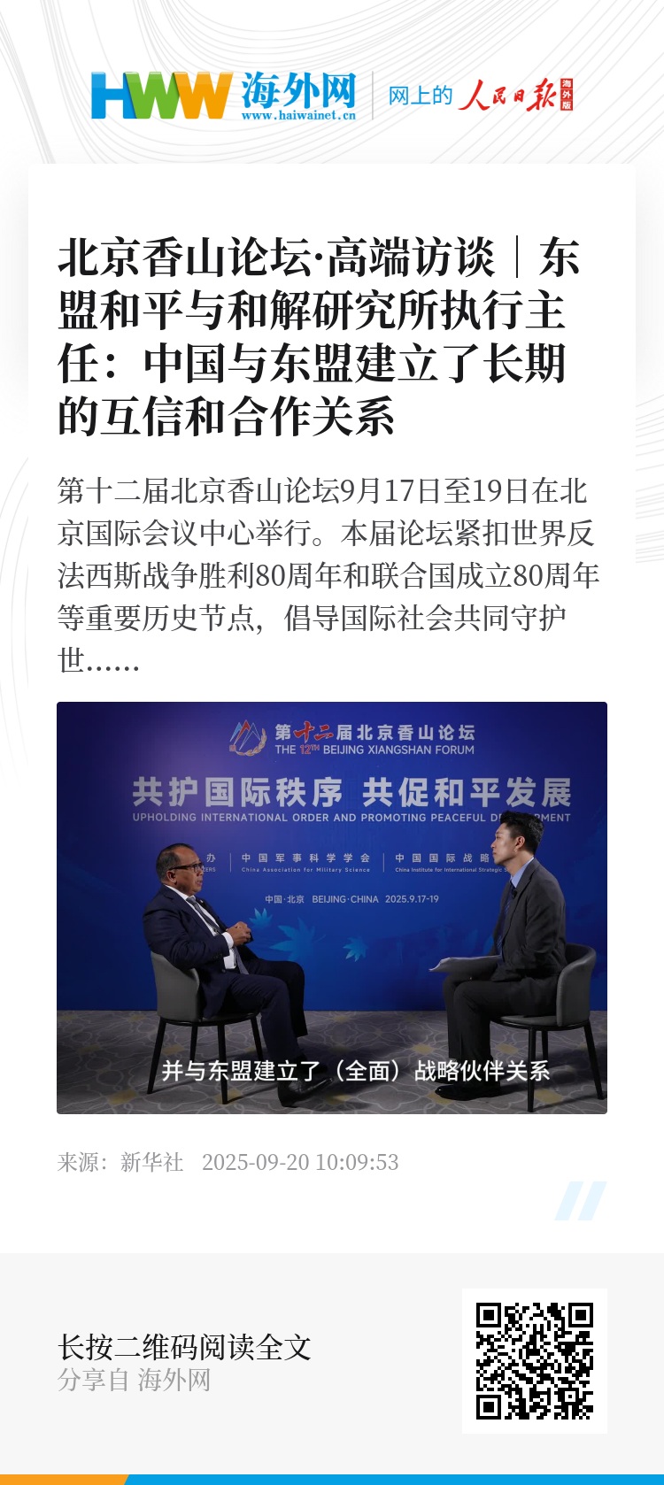 9月18日,东盟和平与和解研究所执行主任、印度尼西亚前常驻联合国代表伊·古斯帝·普加围绕中国与东盟的关系建构与未来合作,接受了新华社记者专访。