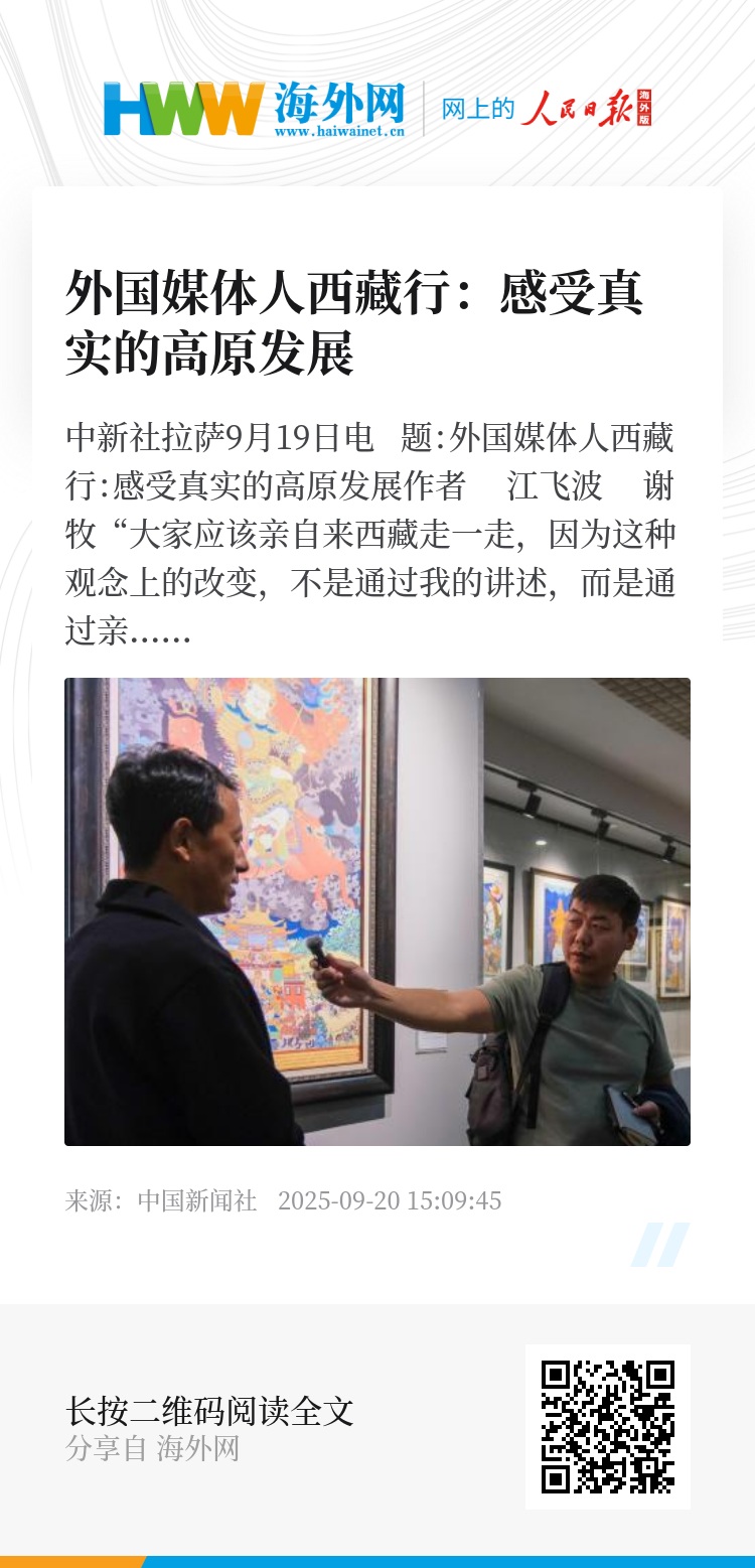 “大家应该亲自来西藏走一走,因为这种观念上的改变,不是通过我的讲述,而是通过亲身体验才能发生的。”9月18日,来自斯里兰卡的自由媒体人达尼杜·维塔纳瓦萨姆在西藏参访时说,此行所见的西藏发展程度和高原传统建筑等令人印象深刻。