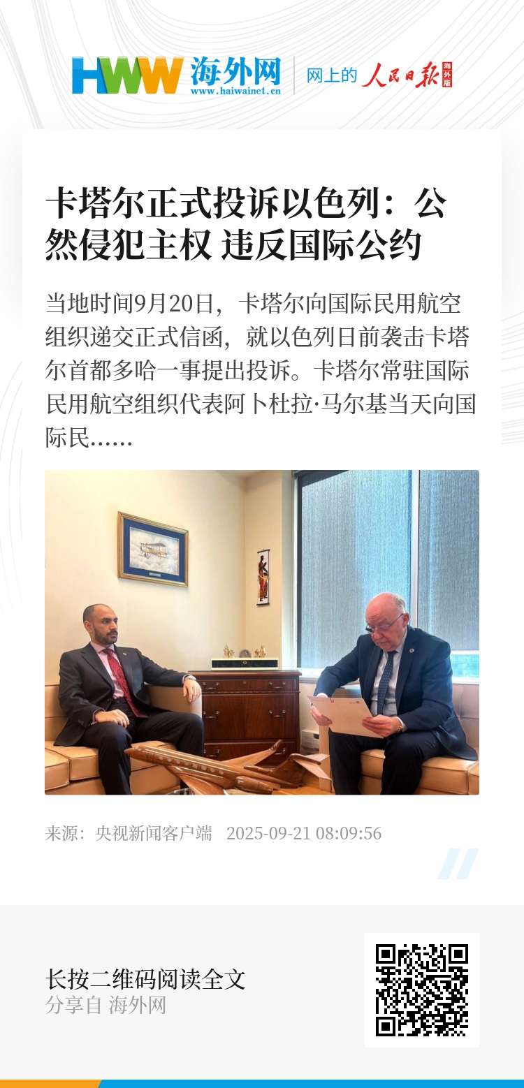卡塔尔常驻国际民用航空组织代表阿卜杜拉·马尔基当天向国际民航组织理事会递交信函。卡塔尔方面在信函中表示,以色列对多哈的空袭公然侵犯卡塔尔主权,严重违反《国际民用航空公约》相关规定,卡塔尔保留依据国际法采取回应措施的权利。