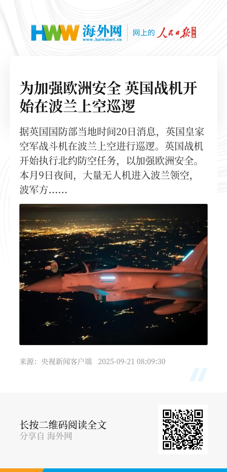 本月9日夜间,大量无人机进入波兰领空,波军方紧急处置并击落部分无人机。波兰政府称无人机来自俄罗斯,俄方则表示尚不能作此断言。英国首相斯塔默表示,“俄罗斯的行为是对欧洲安全的直接威胁”。英国国防部长希利表示,“北约团结一致,英国也将尽责。受到威胁时,我们将共同应对。”12日,北约秘书长吕特表示,目前,北约正在部署“东方哨兵”系统以强化东翼防御态势。该系统将整合丹麦、法国、英国、德国等多个盟友的军事资源。14日,波兰总统签署决议,同意北约部队驻扎该国领土。(总台记者 杨兢兢)